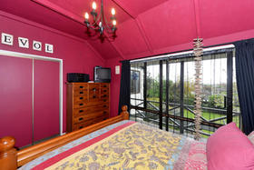 The bedrooms are on the upper level away from it all. The property has two bathrooms, one on each level.