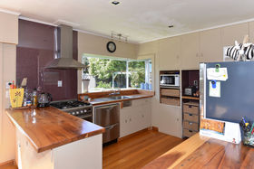 Entering through the ranch slider to the large open space of the kitchen/dining and lounge. With the combination of wooden floor boards, a large wooden beam ceiling and an Tasmanian blackwood bench top, this home really does have personality along with a lovely homely feel.