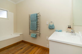 Inside, the beautifully polished Rimu floors are complemented by a modern light colour scheme throughout, creating an inviting environment. The open plan living dining features both a fireplace and heatpump and leads out through bi fold doors to the deck and courtyard to enjoy the sun and privacy.