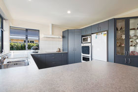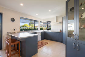 spacious modern kitchen overlooking the sunny backyard is a chef's delight.