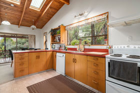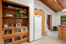 Come inside and you will be amazed at how well designed this lovely home is. The large living area is swamped with sun and light from the large dual aspect windows bringing the outside in, high stud timber vaulted ceilings give a wonderful sense of space. Through to the dining / kitchen and the character continues with gorgeous built in hutch, large functional kitchen and vaulted ceilings with skylights. Off the dining is that all important outdoor flow with a covered deck perfect for all seasons. Happiness oozes from out here, whether for entertaining or just simply sitting and contemplating the world whilst you enjoy the harvests from your garden, admire the mature landscape and listen to the bird song.